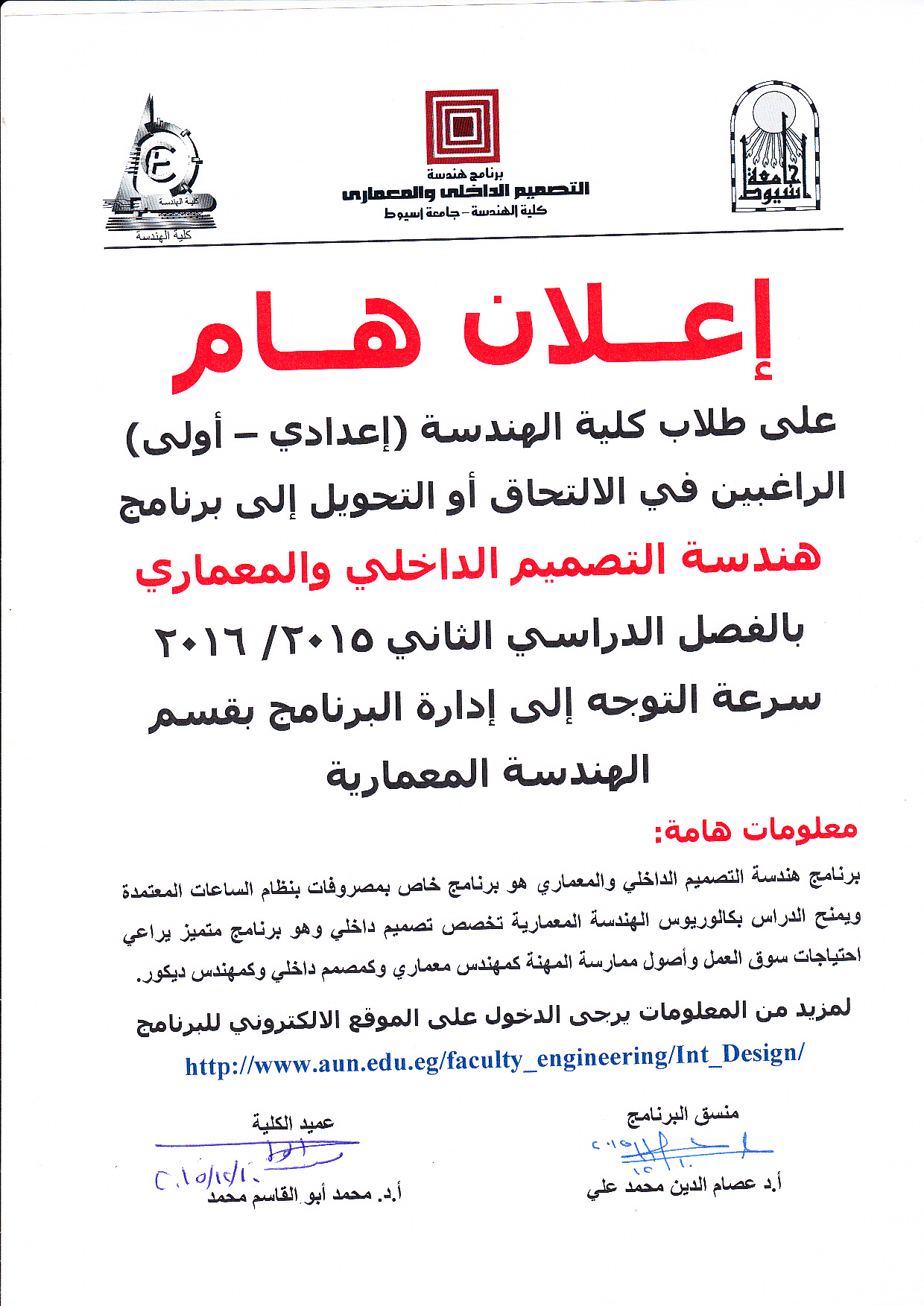 على طلاب كلية الهندسة (إعدادي - أولى ) ، الراغبين في الإلتحاق أو التحويل إلى برنامج هندسة التصميم الداخلي والمعماري بالفصل الدراسي الثاني 2015/2016 سرعة التوجه إلى إدارة البرنامج بقسم الهندسة المعمارية.