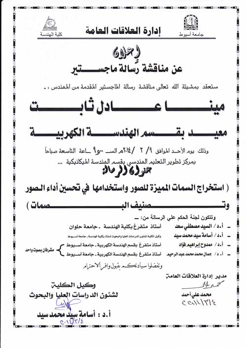 سوف تعقد بمشيئة الله تعالى مناقشة رسالة الماجستير المقدمة من المهندس/ مينا عادل ثابت