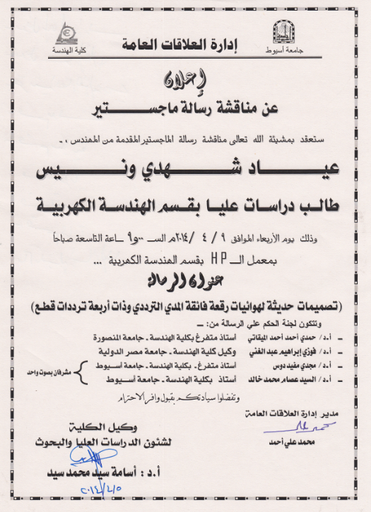 سوف تعقد بمشيئة الله تعالى مناقشة رسالة الماجستير المقدمة من المهندس/ عياد شهدى ونيس