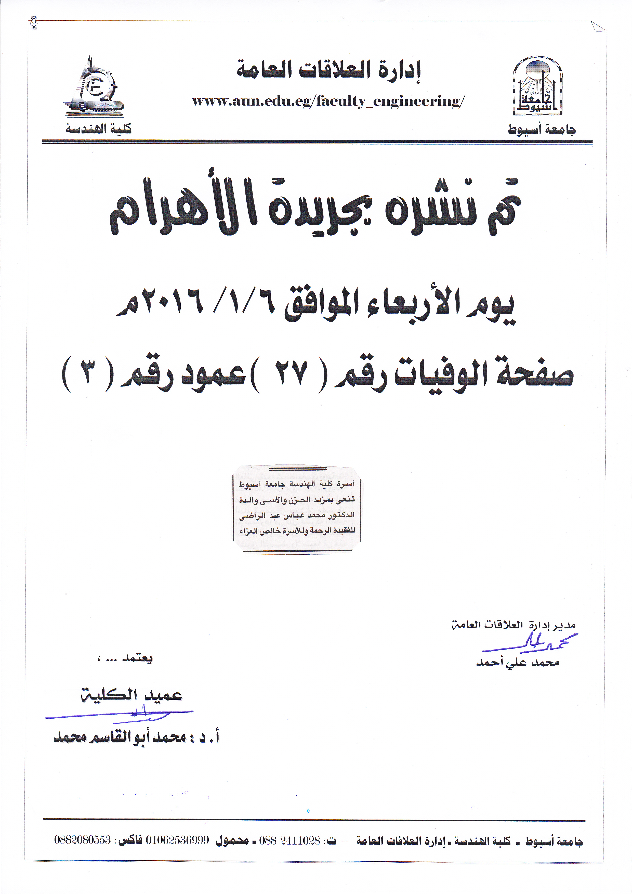 البقاء لله لوفاة والدة الدكتور محمد عباس عبدالراضى 6 يناير 2016 البقاء لله لوفاة والدة الدكتور محمد عباس عبدالراضى