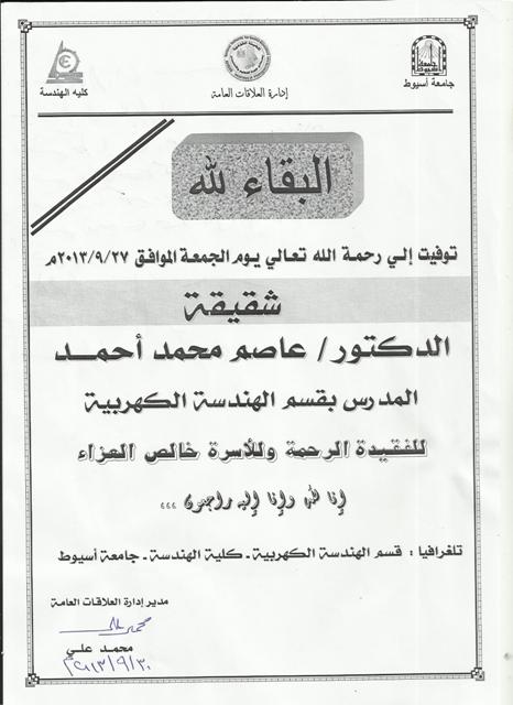 البقاء لله - توفيت الى رحمة الله شقيقة الدكتور/ عاصم محمد أحمد - المدرس بقسم الهندسة الكهربية