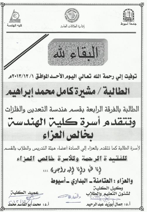 البقاء لله وفاة الطالبة /مشيرة كامل محمد ابراهيم بقسم هندسة التعدين والفلزات