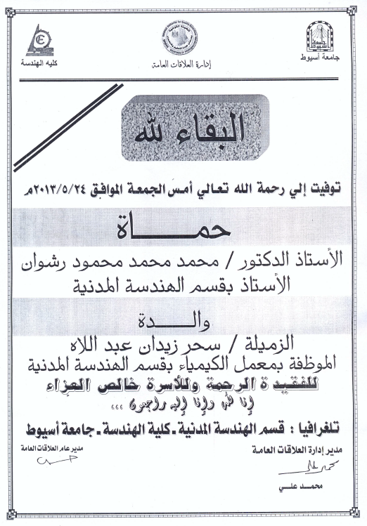 البقاء لله - وفاة حماة الدكتور محمد محمد محمود رشوان الأستاذ بقسم الهندسة المدنية 25 مايو 2013 البقاء لله وفاة حماة الدكتور محمد محمد محمود رشوان الأستاذ بقسم الهندسة المدنية امس الجمعة الموافق 24/5/2013 للفقيدة الرحمة وللأسرة خالص العزاء "إنا لله وانا لله وان اليه راجعون"