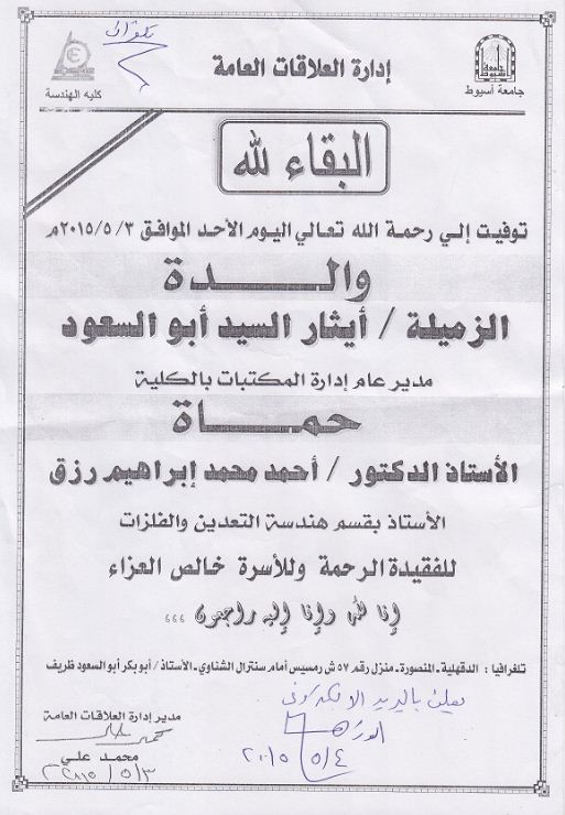 البقاء لله وفاة والدة الزميلة /أيثار السيد أبو السعود 5 مايو 2015 توفيت إلى رحمة الله يوم الأحد الموافق 3/5/2015م والدة الزميلة /أيثار السيد أبو السعود مدير عام ادارة المكتبات بالكلية للفقيدة الرحمة وللأسرة خالص العزاء إنا لله وإنا إليه راجعون ،،،