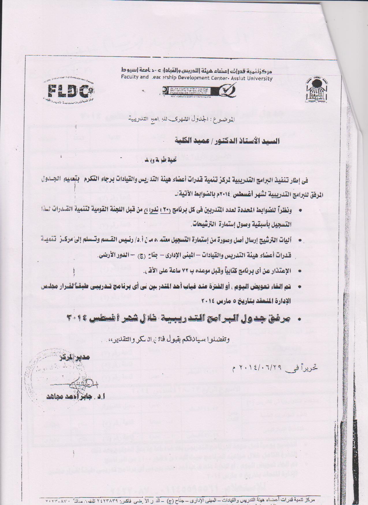 فى اطار تنفيذ البرامج التدربية لمركز تنمية قدرات السادة اعضاء هيئة التدريس والقيادات خلال يوليو2014 م ونظرا للضوابط المحددة لعدد المتدربين فى كل برنامج (20 متدرب)من قبل اللجنة القومية لتنمية القدرات لذا التسجيل باسبقية وصول خطاب الترشيح .