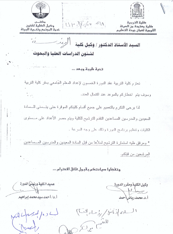 تعتزم كلية التربية عقد الدورة الخمسون لإعداد المعلم الجامعى بمقر كلية التربية وسوف يتم الإخطار عند اكتمال العدد