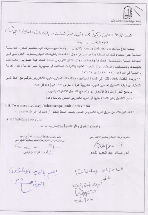 الدورة التدريبية السادسة عشرلاستخدامات الميكروسكوب الإلكتروني 9 نوفمبر 2014 الدورة التدريبية السادسة عشر لاستخدامات الميكروسكوب الإلكتروني فى الفترة من 21 / 3 : 25 / 3 / 2015م لمعرفة المزيد ادخل على الرابط التالى: http://www.aun.edu.eg/microscope_unit/index.htm