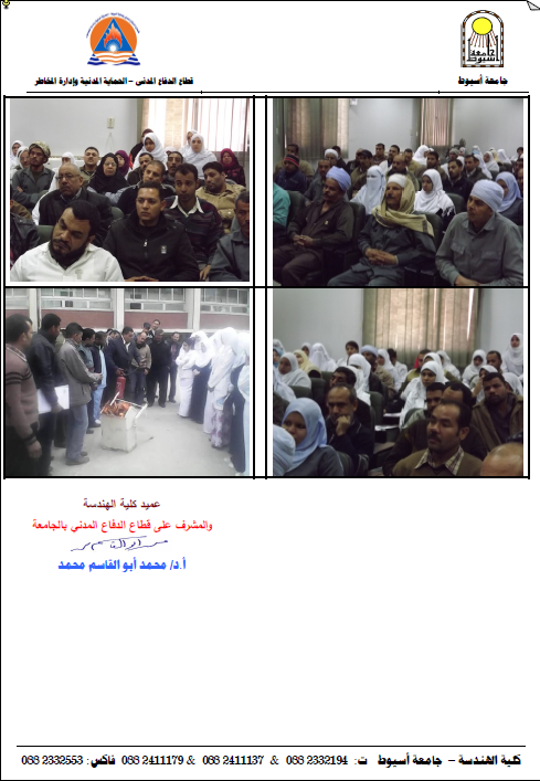 استمراراً للدور الذي تقوم به جامعة أسیوط لحمایة أفرادها ومنشآتها، وتوفیر بیئة ملائمة للعمل الجاد، قامت إدارة الحمایة المدنیة بعقد "دورة تدريبية للسادة العاملين بمعهد جنوب مصر للأورام" في الفترة من 30/12/2014 حتى 1/1/2015، وذلك برعایة كریمة من السيد الأستاذ الدكتور/ محمد عبد السميع عيد- رئيس الجامعة ... والسيد الأستاذ الدكتور/ حسن صلاح كامل..نائب رئيس الجامعة لشئون خدمة المجتمع وتنمية البيئة. وتضمنت هذه الندوة المحاور التالیة :