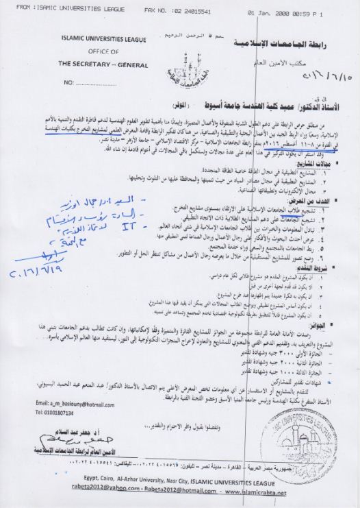 المعرض العلمى لمشاريع التخرج بكليات الهندسة فى الفترة من 8-11 أغسطس 2016 م بمقر رابطة الجامعات الاسلامية - مركز الاقتصاد الاسلامى- جامعة الأزهر - مدينة نصر