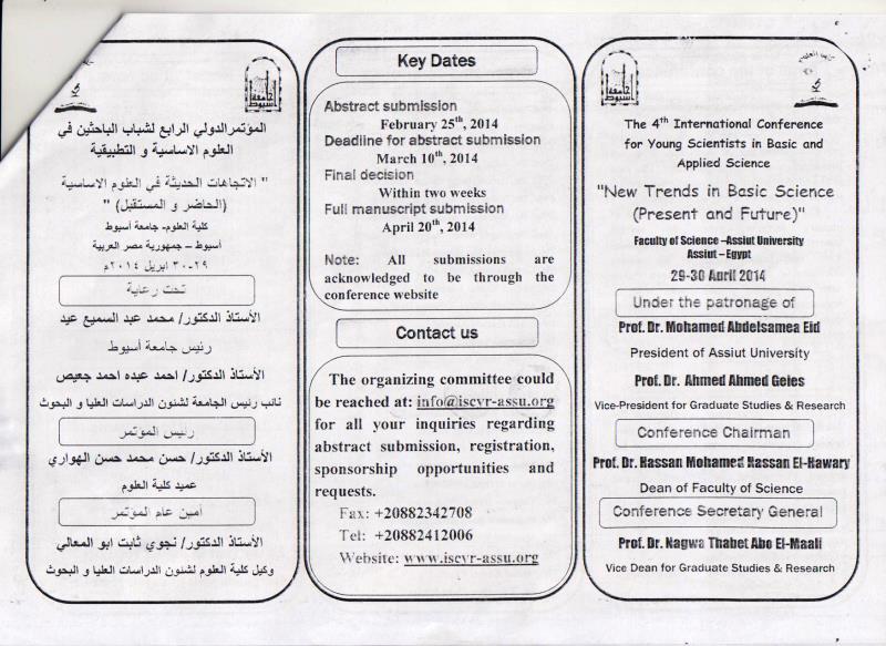 المؤتمر الدولى الرابع لشباب الباحثين تحت عنوان الاتـجاهات الحديثة لشباب الباحثين فى العلوم الأساسية الحاضر والمستقبل والذى سيعقد بمشيئة الله فى الفترة من 29-30 ابريل 2014م والذى تعقدة كلية العلوم جامعة أسيوط