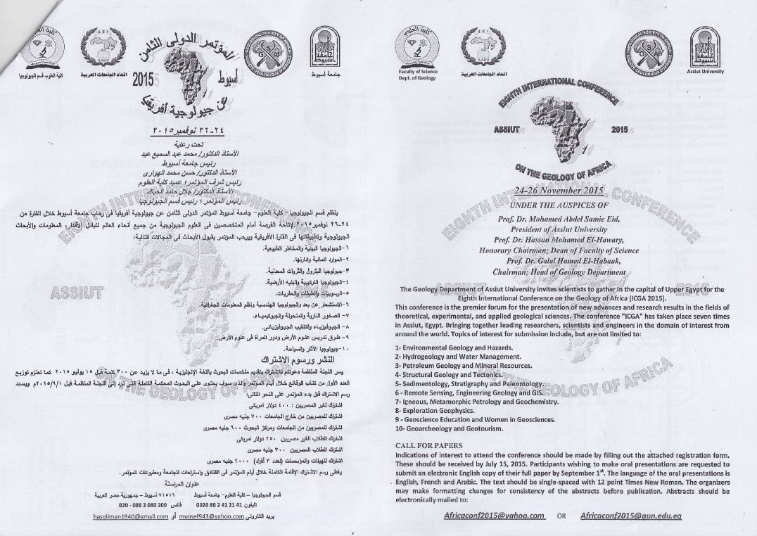 المؤتمر الدولى الثامن عن جيولوجية أفريقيا أسيوط 2015 8 يوليو 2015 المؤتمر الدولى الثامن عن جيولوجية أفريقيا أسيوط 2015 فى الفترة من 24-26 نوفمبر 2015