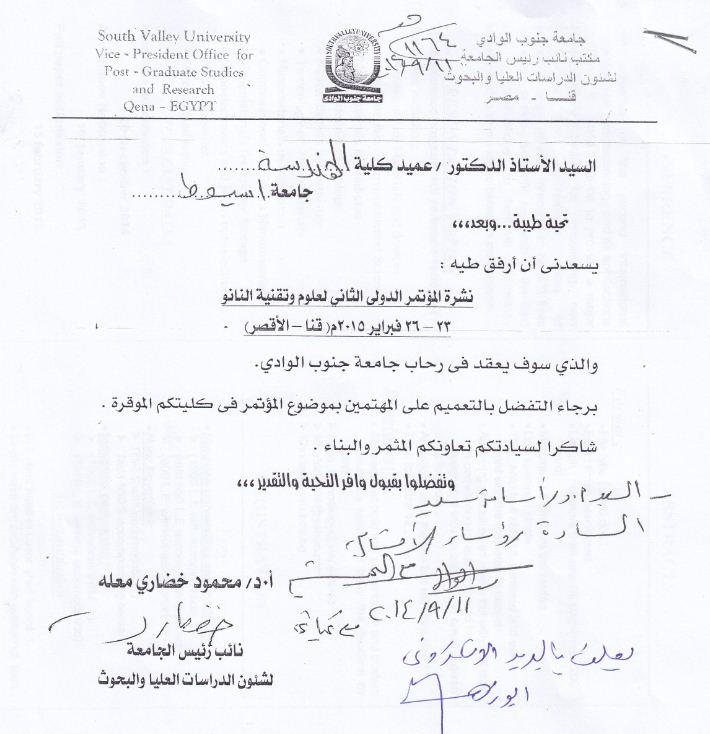 المؤتمر الدولى الثانى لعلوم وتقنية النانو من 23-26 فبراير 2015 م ( قنا -الأقصر) 15 سبتمبر 2014 سوف يعقد بمشيئة الله المؤتمر الدولى الثانى لعلوم وتقنية النانو من 23-26 فبراير 2015 م ( قنا -الأقصر) فى رحاب جامعة جنوب الوادى
