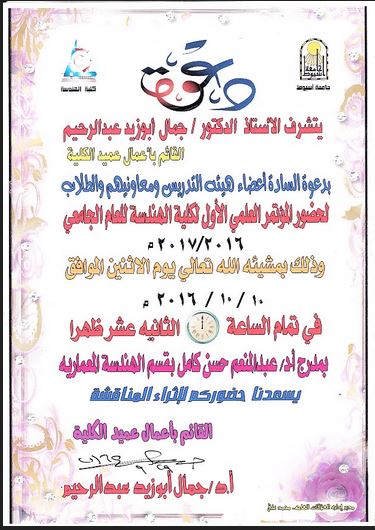يتشرف الأستاذ الدكتور/ جمال أبوزيد عبدالرحيم، القائم بأعمال عميد الكلية، بدعوة السادة أعضاء هيئة التدريس ومعاونيهم والطلاب لحضور المؤتمر العلمى الأول لكلية الهندسة للعام الجامعى 2016-2017 وذلك بمشيئة الله تعالى يوم الإثنين الموافق 10-10-2016 فى تمام الساعة الثانية عشر ظهراً بمدرج أ.د/عبد المنعم حسن كامل بقسم الهندسة المعمارية.