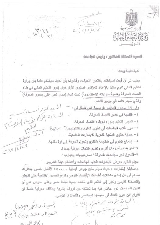 المؤتمر السنوى الأول حول (دور التعليم العالى فى بناء اقتصاد المعرفة وتنمية مجالاته الإستثمارية) 29 أبريل 2015 المؤتمر السنوى الأول حول (دور التعليم العالى فى بناء اقتصاد المعرفة وتنمية مجالاته الإستثمارية)