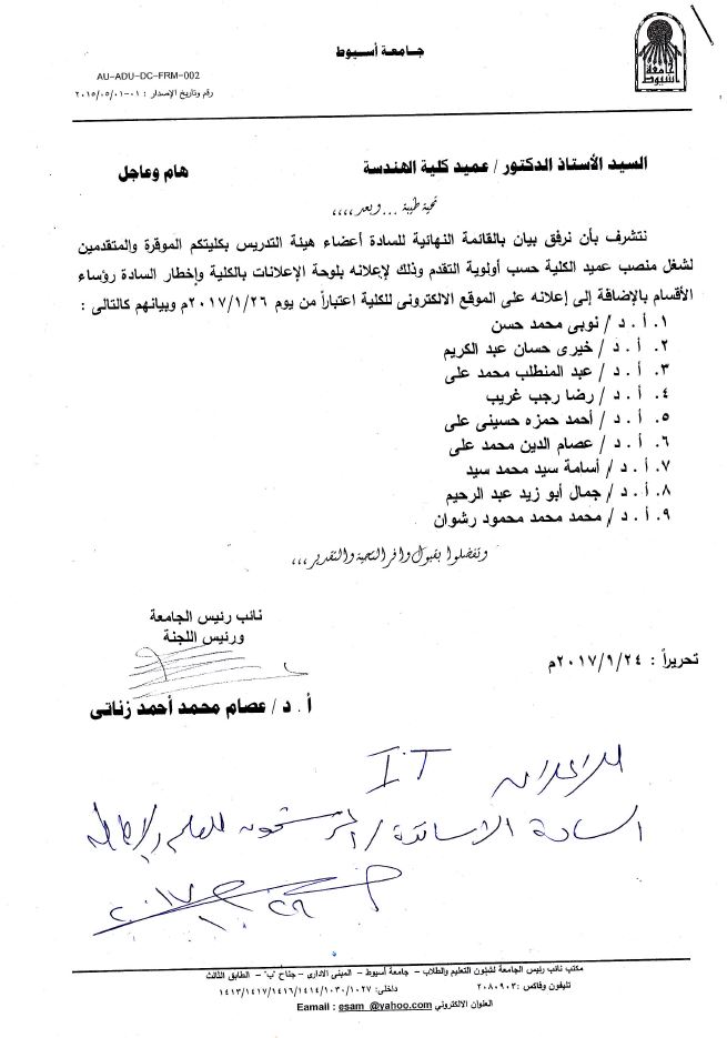 القائمة النهائية للسادة أعضاء هيئة التدريس المرشحين لمنصب عميد كلية الهندسة 26 يناير 2017 القائمة النهائية للسادة أعضاء هيئة التدريس المرشحين لمنصب عميد كلية الهندسة