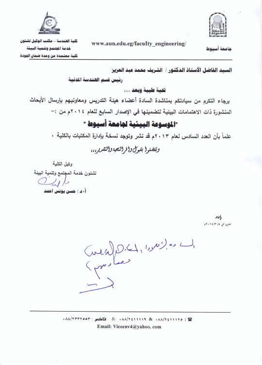 الرجاء من السادة اعضاء هيئة التدريس ومعاونيهم بارسال الأبحاث المنشورة ذات الأهتمامات البيئية 6 مارس 2014 الرجاء من السادة اعضاء هيئة التدريس ومعاونيهم بارسال الأبحاث المنشورة ذات الأهتمامات البيئية لتضمينها فى الإصدار السابع للعام 2014 من:- الموسوعة البيئية لجامعة أسيوط علماً بأن العدد السادس لعام 2013قد نشر وتوجد وتوجد نسخة بإدارة المكتبات بالكلية