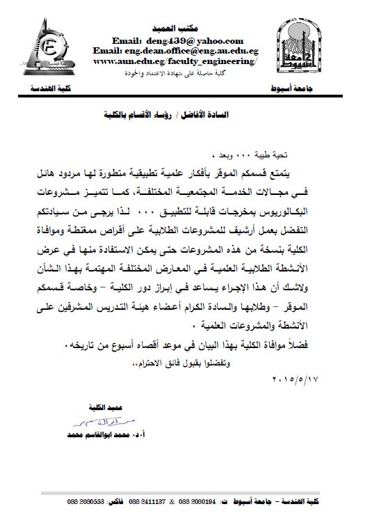 یتمتع قسمكم الموقر بأفكار علمیة تطبیقیة متطورة لها مردود هائل في مجالات الخدمة المجتمعیة المختلفة، كما تتمیز مشروعات البكالوریوس بمخرجات قابلة للتطبیق ٠٠٠ لذا یرجى من سیادتكم التفضل بعمل أرشیف للمشروعات الطلابیة على أقراص ممغنطة وموافاة الكلیة بنسخة من هذه المشروعات حتى یمكن الاستفادة منها في عرض الأنشطة الطلابیة العلمیة في المعارض المختلفة المهتمة بهذا الشأن ولاشك أن هذا الإجراء یساعد في إبراز دور الكلیة - وخاصة قسمكم الموقر - وطلابها والسادة الكرام أعضاء هیئة التدریس المشرفین على الأنشطة والمشروعات العلمیة ٠فضلاً موافاة الكلیة بهذا البیان في موعد أقصاه أسبوع من تاریخه