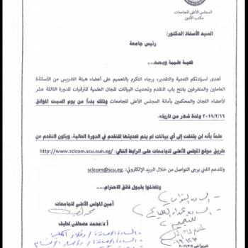 فتح باب التقدم وتحديث البيانات للجان العلمية للترقيات للدورة الثالة عشر لأعضاء اللجان والمحكمين بأمانة المجلس الأعلى للجامعات بدءا من يوم السبت الموافق 16/2/2019 ولمدة شهر من تاريخه