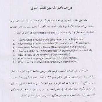 بناء عى طلب الباحثين فى الجامعات المصرية ومراكز البحوث المصرية , فقد تقرر توفير خدمة دورات مكتبة الأسكندرية داخل الجامعات لتأهيل الباحثين المصريين لنشر الأبحاث السابقة والدراسات التصنيفية.