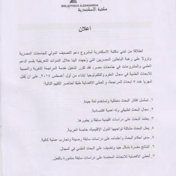 انطلاقا من تبنى مكتبة الأسكندرية لمشروع دعم التصنيف الدولى للجامعات المرية ونزولا على رغبة الباحثين المصريين فقد تقرر تشغيل خدمة المراجعة اللغوية والنصية للأبحاث العلمية فى مجال العلوم والتكنولوجيا…