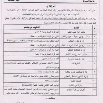 وصل الى السيد الأستاذ الدكتور /عميد كلية الهندسة قرار من مكتب رئاسة الجامعة باعفاء العاملين بأقسام الجامعة المختلفة الدائمين والموسمين من الحضور خلال الفترة من 24/5/2014 حتى 29/5/2014 ومن تتطلب…