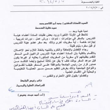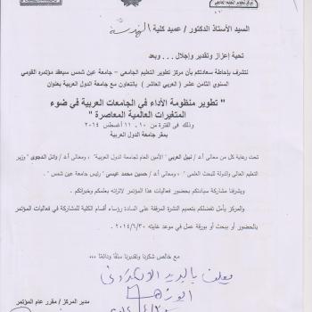 وصل خطاب الى السيد الأستاذ الدكتور عميد كلية الهندسة من اجل اعلانة على السادة اعضاء هيئة التدريس بجميع اقسام الكلية يتضمن هذا الخطاب الآتى عدم جواز عقد اى مؤتمرات دولية بالكلية دون الحصول على…