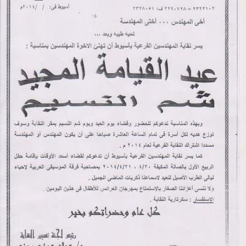 قدمت نقابة المهندسين الفرعية بأسيوط تهنئة للأخوة المهندسين بقضاء يوم شم النسيم وسوف توزع هدايا لكل أسرة فى تمام الساعة العاشرة صباحا على ان يكون المهندس او المهندسة مسددأ اشتراك النقابة الفرعية…