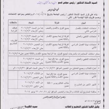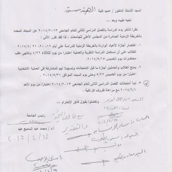 نظراً لتأخر بدء الدراسة بالفصل الدراسى الثانى للعام الجامعى 2013/2014 عن الميعاد المحدد بالخريطة الزمنية الصادرة من المجلس الأعلى للجامعات لذا فقد تقرر الآتى: