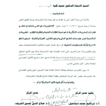 دعوة حضور ورشة عمل من قبل وحدة ادارة المشروعات بوزارة التعليم العالى بجامعة أسيوط تحت عنوان