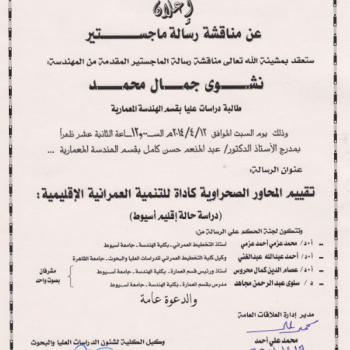 سوف تعقد بمشيئة الله تعالى مناقشة رسالة الماجستير المقدمة من المهندسة/ نشوى جمال محمد