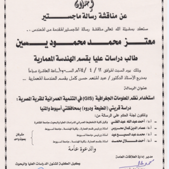 سوف تعقد بمشيئة الله تعالى مناقشة رسالة الماجستير المقدمة من المهندس/ معتز محمد محمود يسينطالب دراسات عليا بقسم الهندسة المعمارية
