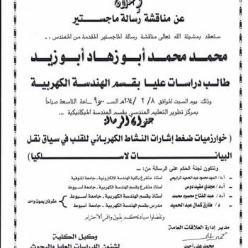 سوف تعقد بمشيئة الله تعالى مناقشة رسالة الماجستير المقدمة من المهندس/ محمد محمد أبوزهاد ابوزيد