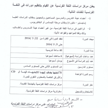 علن مركز دراسات اللغة الفرنسية عن القيام بتنظيم دورات فى اللغة الفرنسية للفئات التالية1- أعضاء هيئة التدريس والمدرسين المساعدين والمعيدين وطلاب للدراسات العليا وطلاب مرحلة الليسانس او…