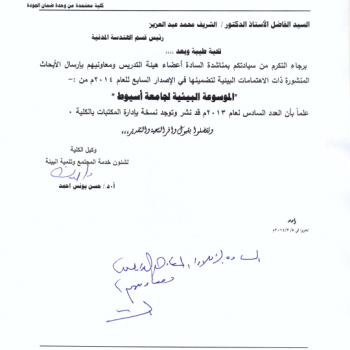 الرجاء من السادة اعضاء هيئة التدريس ومعاونيهم بارسال الأبحاث المنشورة ذات الأهتمامات البيئية لتضمينها فى الإصدار السابع للعام 2014 من:-