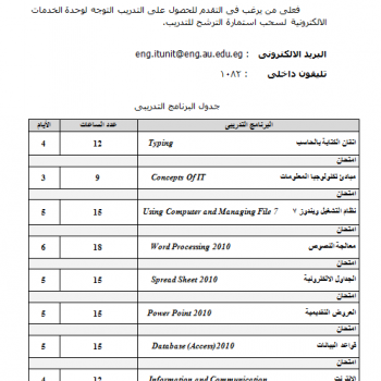 تعلن وحدة الخدمات الإلكترونية بكلية الهندسة عن تقديم دورات تدريبة مجانية للسادة الموظفين فى شهر مارس الحالى ويتم الترشيح من قبل العميد أو الرئيس المباشر او رئيس القسم عن طريق ملئ…