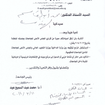 المجلس الأعلى للجامعات احاط علما بجلسته المنعقدة بتاريخ 13/2/2014 والذى يتضمن ما يلىالبرتكول المزمع توقيعة بين وزارة الداخلية ووزارة التعليم العالى لتأمين الجامعات الحكومية التأكيد على حظر اى…
