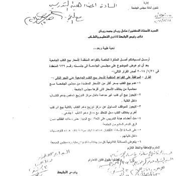 عدم بيع الكتب بسعر اكثر من الأسعار المعتمدة من مجلس الجامعة مع محاسبة من يخالف الأسعار التى اقرها مجلس الجامعة