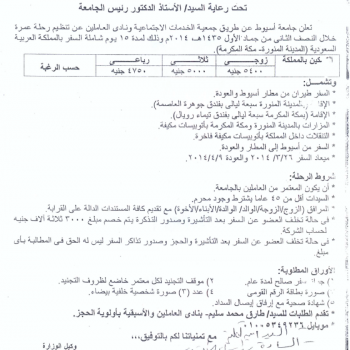 تعلن جامعة أسيوط عن طريق جمعية الخدمات الأجتماعية ونادى العاملين عن تنظيم رحلة عمرة خلال النصف الثانى من جماد الأول1435هـ وذلك لمدة 15 يوم شاملة السفر بالمملكة العربة السعودية (المدينة المنورة-…