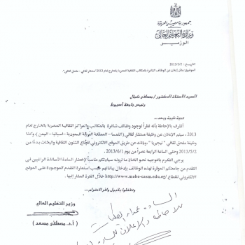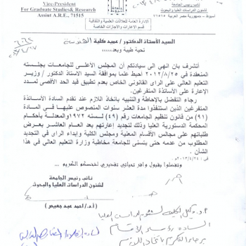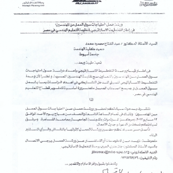 وجهت وحدة المعلومات بالمكتب الفنى للسيد الوزير خطاب للسيد الأستاذ الدكتور/ عميد كلية الهندسة بصدد تحديث البيانات للسادة اعضاء هيئة التدريس بالجامعات طلبت فيه الآتى: