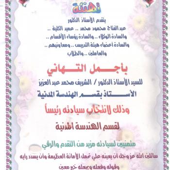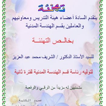 تهنئة مقدمة من قسم الهندسة المدنية للسيـد الأستاذ الدكتــور/ الشريف محمد عبدالعزيز لتوليه رئاسة قسم الهندسة المدنية لفترة ثانية