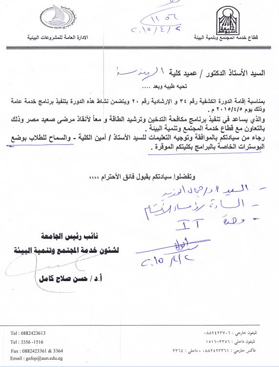 إقامة الدورة الكشفية رقم 34 والإرشادية رقم 20 4 أبريل 2015 يتضمن نشاط هذه الدورة بتنفيذ برنامج خدمة عامة وذلك يوم 5/4/2015 م. والذى يساعد فى تنفيذ برنامج مكافحة التدخين وترشيد الطاقة ومعاً لإنقاذ مرضى صعيد مصر