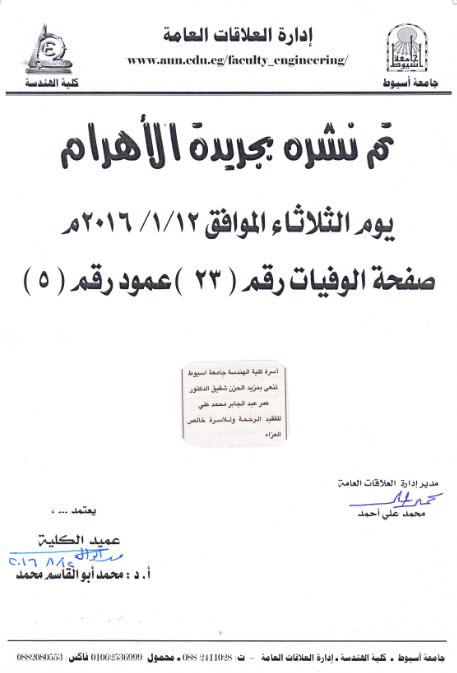 أسرة كلية الهندسة تنعى شقيق الدكتور/ عمر عبدالجابر محمد على 12 يناير 2016 أسرة كلية الهندسة تنعى شقيق الدكتور/ عمر عبدالجابر محمد على