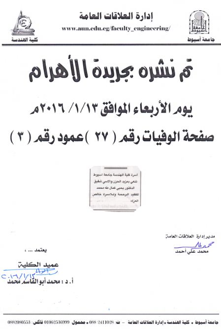 أسرة كلية الهندسة تنعى شقيق الدكتور/ يحيى كمال طه محمد 13 يناير 2016 أسرة كلية الهندسة تنعى شقيق الدكتور/ يحيى كمال طه محمد