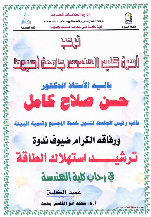 أسرة كلية الهندسة ترحب بالسيد الأستاذ الدكتور/حسن صلاح -نائب رئيس الجامعة لشئون خدمة المجتمع وتنمية البيئة 22 فبراير 2015 ترحب أسرة كلية الهندسة جامعة أسيوط بالسيد الأستاذ الدكتور حسن صلاح كامل نائب رئيس الجامعة لشئون خدمة المجتمع وتنمية البيئة ورفاقه الكرام ضيوف ندوة ترشيد استهلاك الطاقة فى رحاب كلية الهندسة