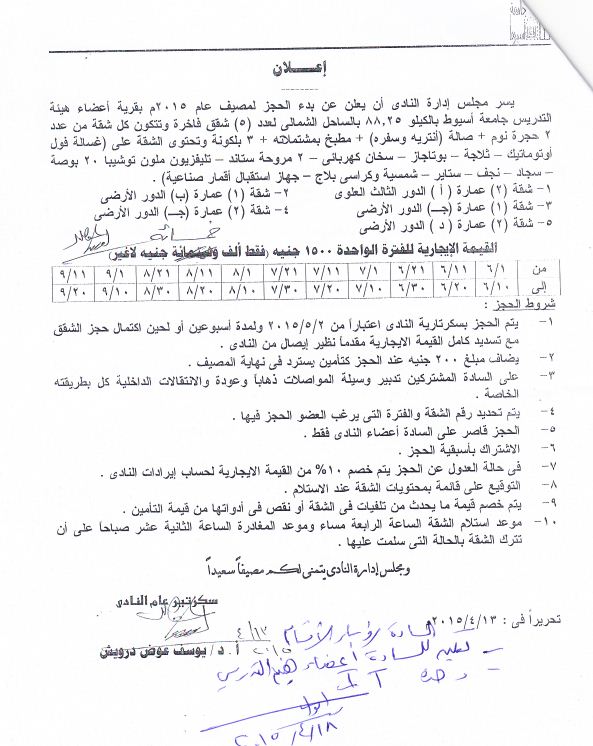 بدء الحجز لمصيف عام 2015 م بقرية أعضاء هيئة التدريس جامعة أسيوط 20 أبريل 2015 يسر مجلس ادارة النادى أن يعلن عن بدء الحجز لمصيف عام 2015 م بقرية أعضاء هيئة التدريس جامعة أسيوط