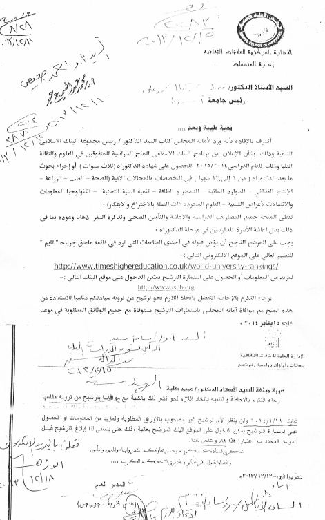 برنامج البنك الإسلامى للمنح الدراسية للمتفوقين فى العلوم والثقافة وذلك للعام الدراسى 2014/2015 للحصول على شهادة الدكتوراة (ثلاث سنوات) او اجراء بحوث ما بعد الدكتوراة من (6الى 12 شهر) فى التخصصات والمجالات الآتية: الصحة - الطب الزراعة الإنتاج الغذائى- التصحر والطاقة-