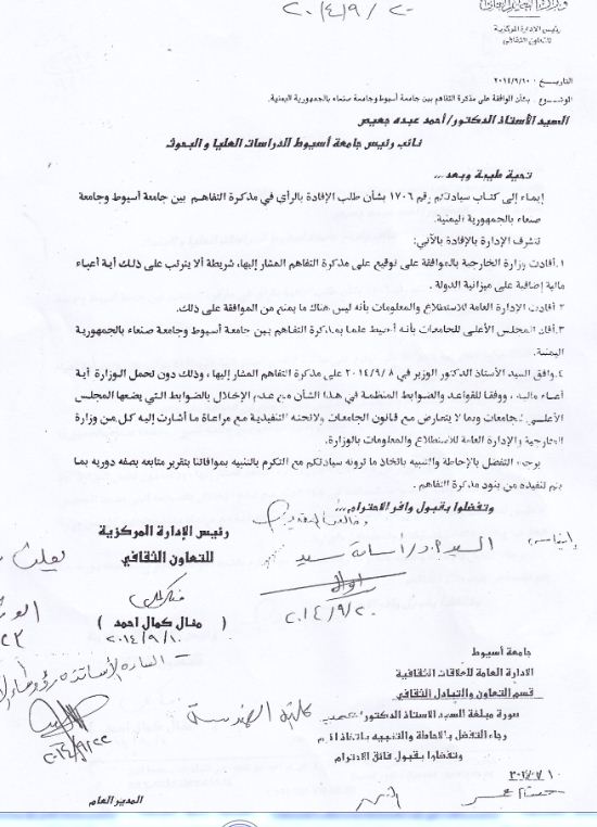 بشأن الموافقة على مذكرة التفاهم بين جامعة أسيوط وجامعة صنعاء بالجمهورية اليمنية 25 سبتمبر 2014 بشأن الموافقة على مذكرة التفاهم بين جامعة أسيوط وجامعة صنعاء بالجمهورية اليمنية