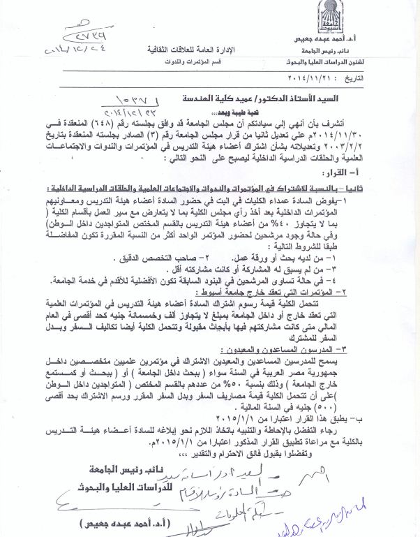 وافق مجلس الجامعة بجلسته رقم 648المنعقدة فى 30/11/2014 على تعديل ثانى من قرار مجلس الجامعة رقم 3 الصادر بجلسته المنعقدة بتاريخ 2/3/2003 وتعديلاته بشأن أشتراك أعضاء هيئة التدريس فى المؤتمرات والندوات والإجتماعات العلمية