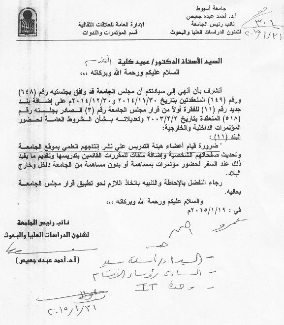 بشأن خطاب السيد الأستاذ الدكتور/ أحمد عبده جعيص نائب رئيس الجامعة لشئون الدرسات العليا والبحوث للسيد الأستاذ الدكتور/ محمد أبو القاسم عميد كلية الهندسة بضرورة التنبيه على السادة أعضاء هيئة التدريس لنشر إنتاجهم العلمى بموقع الجامعة وتحديث صفحاتهم الشخصية وإضافة ملفات للمقررات القائمين بتدريسها وتقديم ما يفيد ذلك عند السفر لحضور مؤتمرات بمساهمة أو بدون مساهمة من الجامعة داخل وخارج البلاد.
