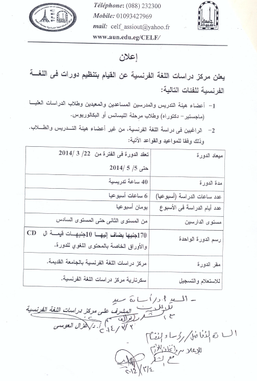 علن مركز دراسات اللغة الفرنسية عن القيام بتنظيم دورات فى اللغة الفرنسية للفئات التالية